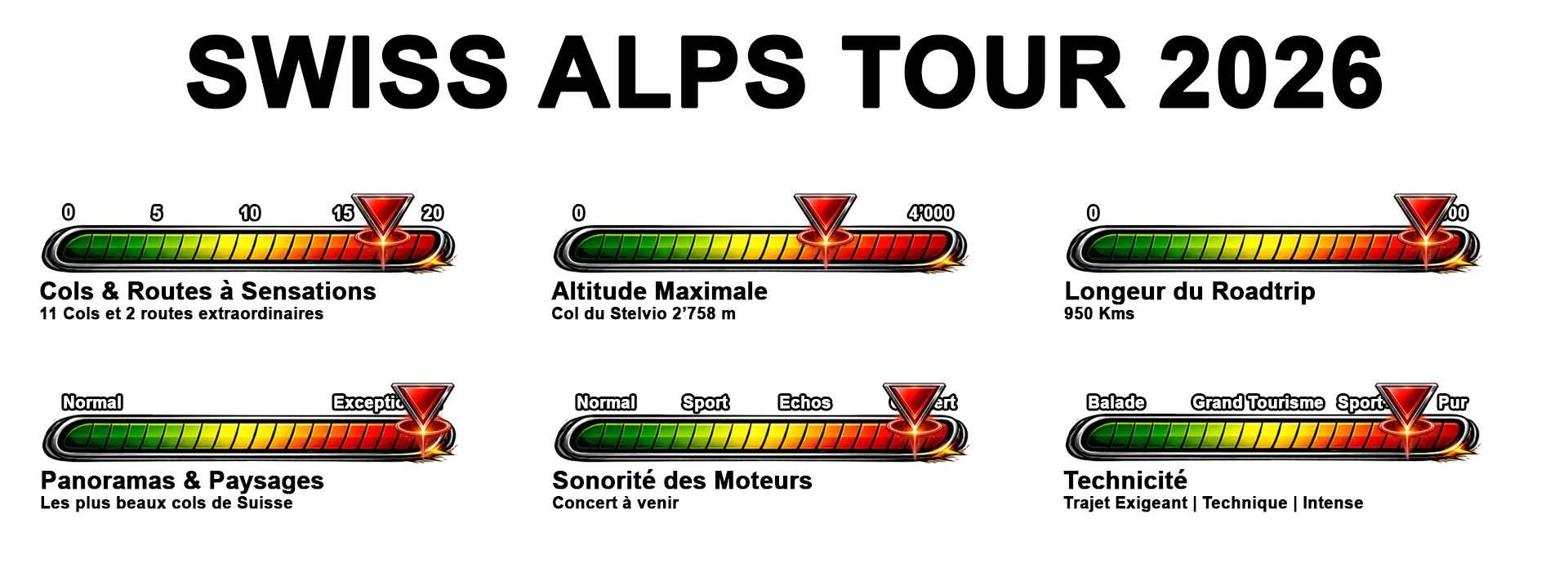 - Le Swiss Alps Tour n’est pas une course. Il s’agit d’un rallye touristique convivial ou nous découvrons de magnifiques routes entre amis. Les réglementations routières doivent être respectées et nous nous réservons le droit de prendre des mesures en cas de troubles occasionnés sur la route. Chaque participant s’engage à respecter les lois en vigueur et les autres usagers de la route.