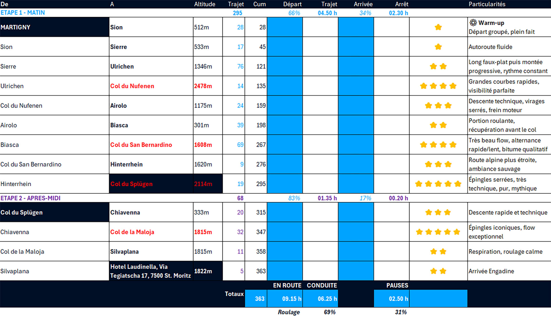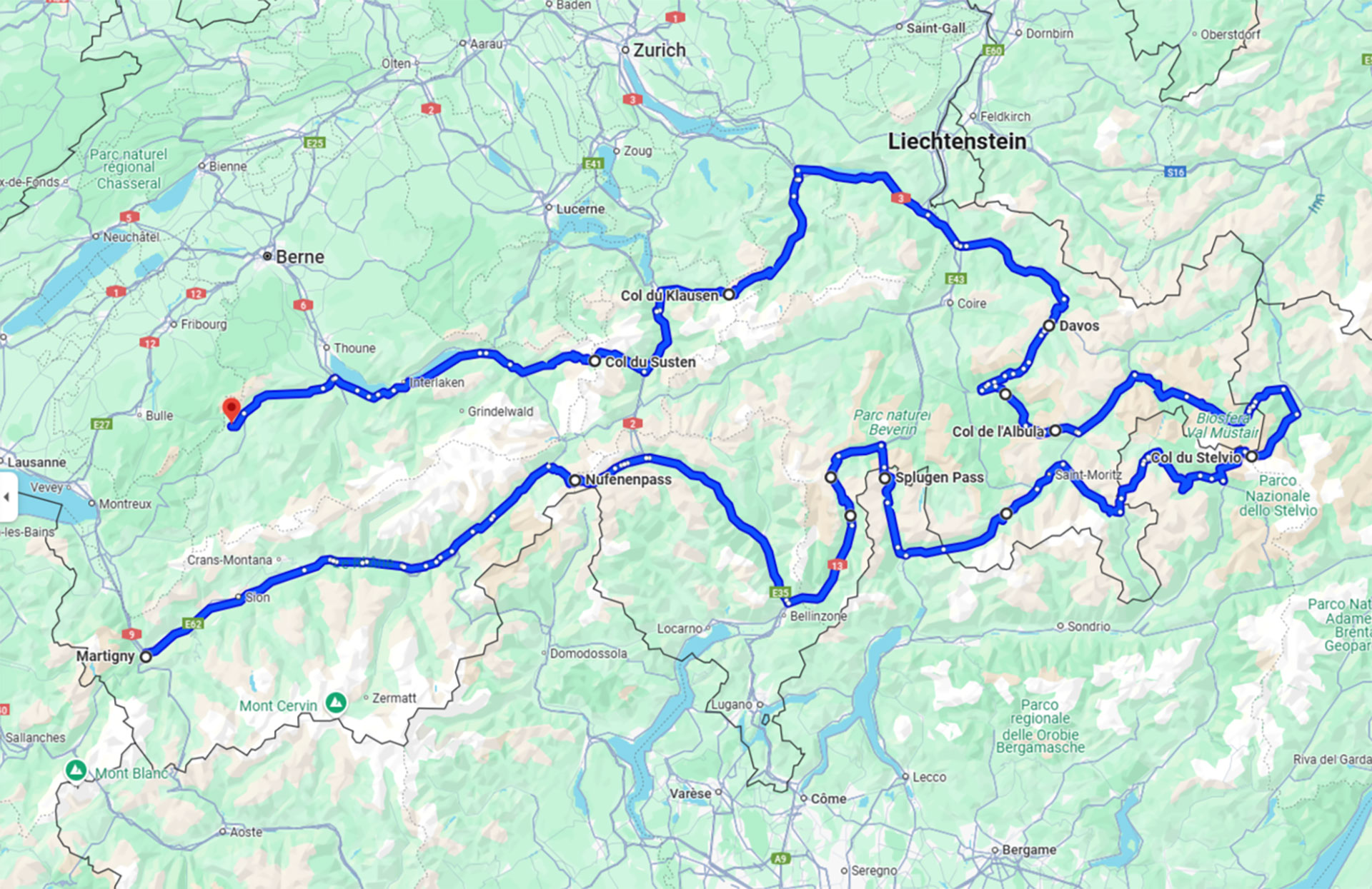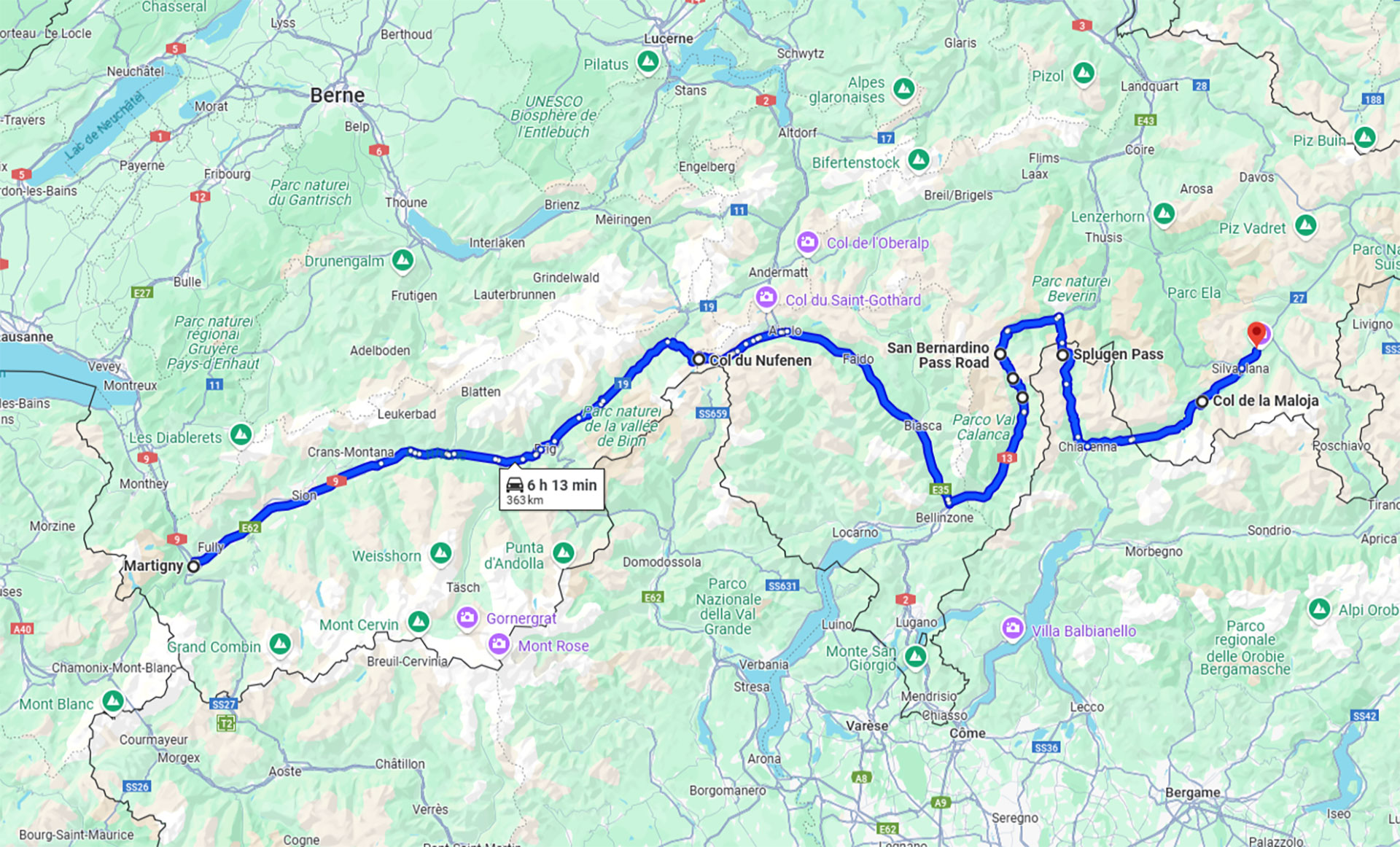 Martigny – Sierre – Ulrichen – Col du Nufenen (2’478m) – Airolo – Biasca – Col du San Bernardino (1’608m) – Col du Splügen (2’114m) – Col de la Maloja (1’815m) – Silvaplana – St-Moritz