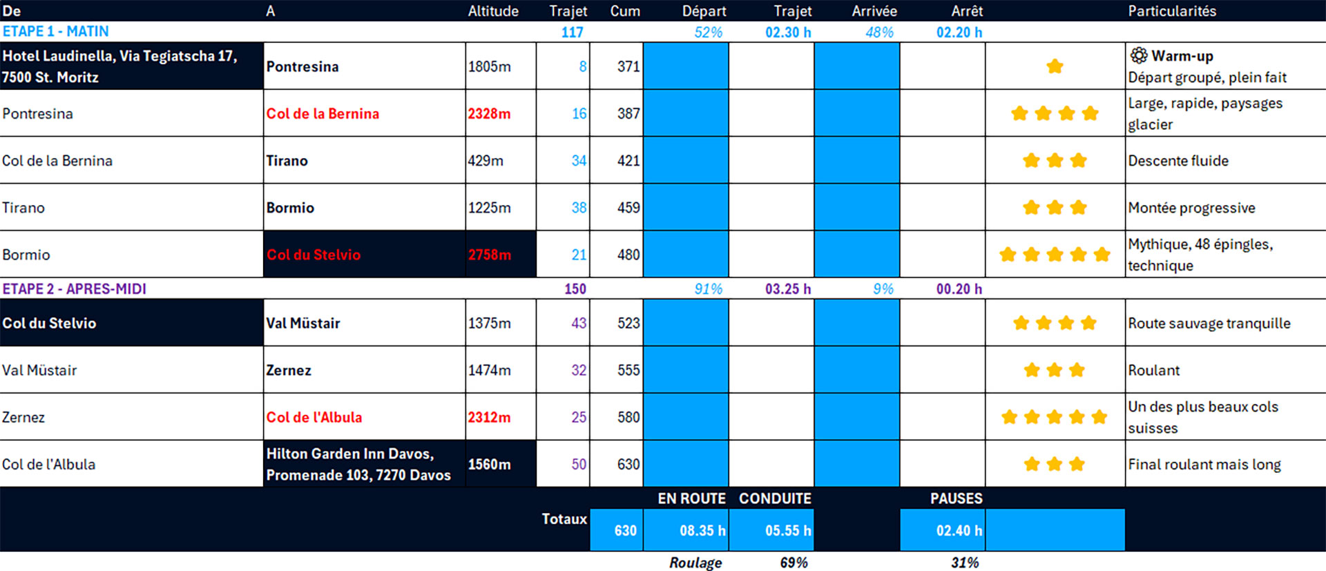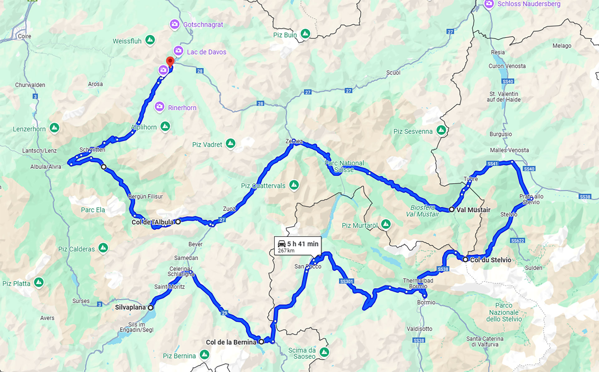 St-Moritz – Pontresina – Col de la Bernina (2’328m) – Tirano – Bormio – Col du Stelvio (2’758m) – Val Müstair – Zernez – Col de l’Albula (2’312m) – Davos