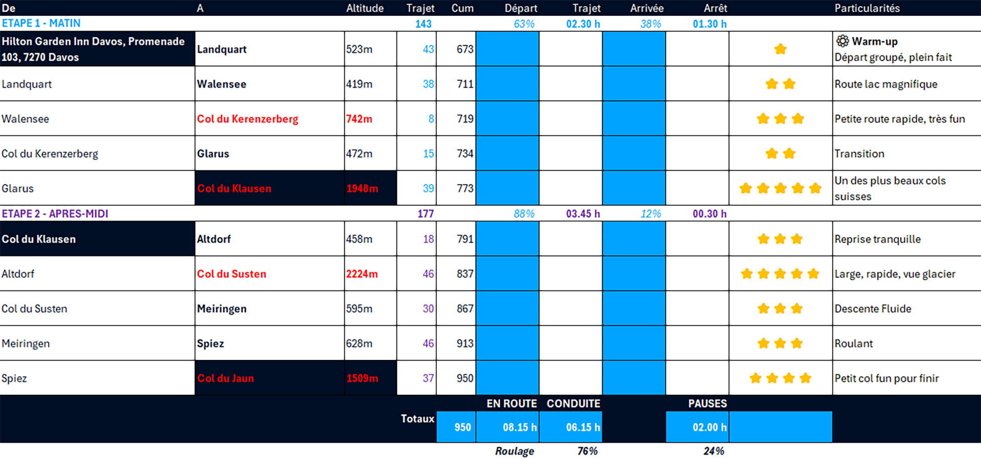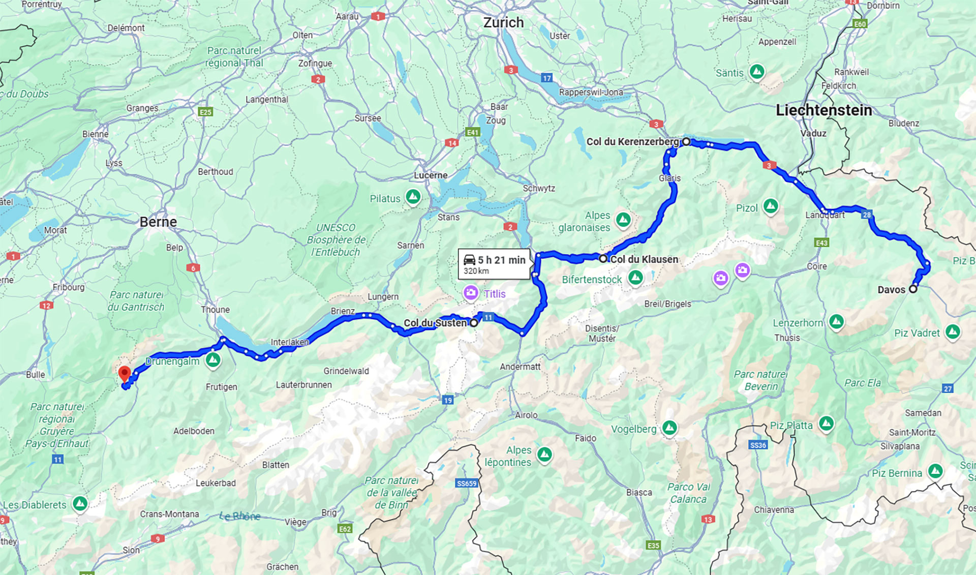 Dimanche : Col du Kerenzerberg (742m) – Col du Klausen (1’946m) – Col du Susten (2’224 m) – Col du Jaun (1’509m) – FIN - Le Parcours complet Googlemaps